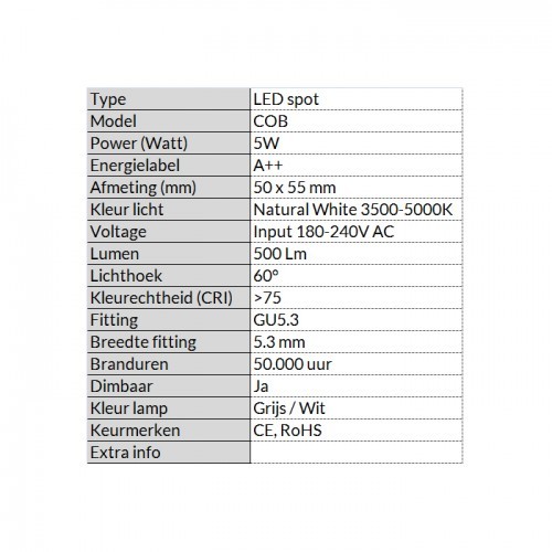 NEUTRAAL WIT (3500-5000K) 5W DIMBAAR