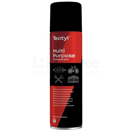 Valvoline Tectyl Multipurpose Transparent (Glashelder) is een kleurloos veelzijdig corrosiepreventiemiddel voor auto-, industrieel, scheepvaart en huishoudelijk gebruik. Biedt speciale bescherming voor industriële en automatische elektrische bedrading en contacten zoals bobine, bougiekabels en klemmen. Kan worden gebruikt op ferro en non-ferro metalen en in verchroomde onderdelen zoals wielen van fietsen.